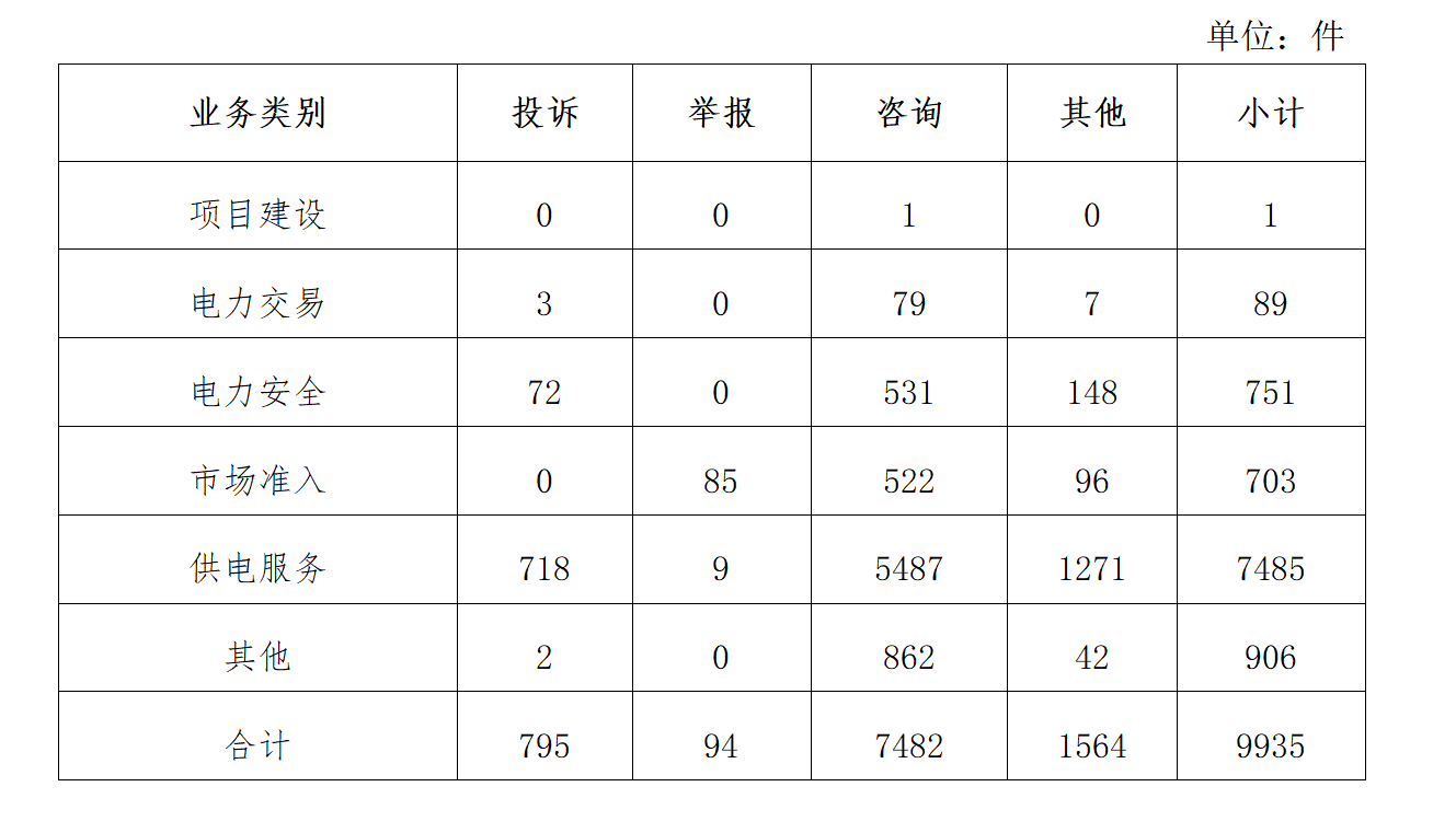 按訴求性質分類,投訴846件,占有效信息的5.99%;舉報94件,占有效信息的0.67%;咨詢11525件,占有效信息的81.64%;表揚、求助、建議等其他方面1652件,占有效信息的11.70%。 按反映渠道分類,12398電話13117件,12398互聯網終端655件,電子郵件200件,留言145件。 二、分類情況 2022年9月收到的有效信息中: 電力行業排在首位,有效信息數量為9935件,占全部有效信息的70.38%。群眾關注的內容主要集中在供電服務、電力安全、市場準入等方面。(2022年9月電力行業有效信息按業務分類情況見表二) 表二 2022年9月電力行業有效信息按業務分類情況
