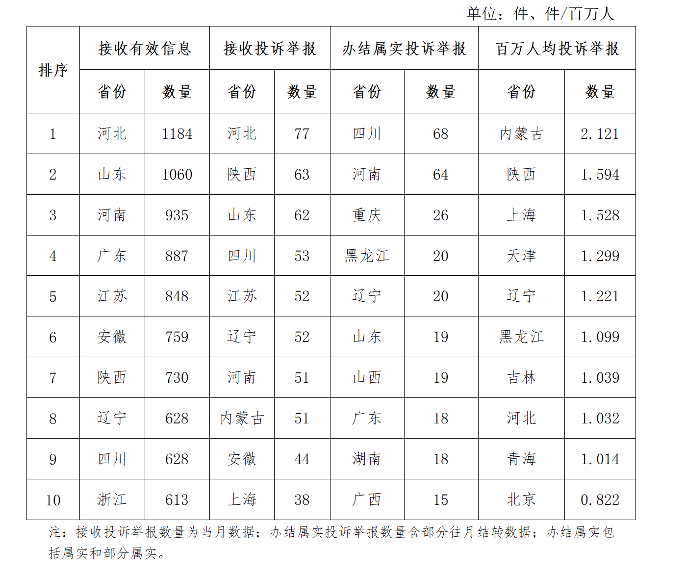 石油天然氣行業排在第二位,有效信息數量為2239件,占全部有效信息的15.86%。群眾關注的內容主要集中在居民燃氣安裝及收費、燃氣故障等方面。 新能源和可再生能源行業排在第三位,有效信息數量為835件,占全部有效信息的5.91%。群眾關注的內容主要集中在分布式光伏發電項目并網,電費結算、補貼發放等方面。 煤炭行業有效信息數量為36件,占全部有效信息的0.26%。群眾關注的內容主要集中在煤炭行業政策、煤炭價格、煤礦安全等方面。 其他有效信息合計1072件,占全部有效信息的7.59%。 三、分布情況 各省(自治區、直轄市)按照接收的有效信息數量排序,河北、山東、河南、廣東、江蘇、安徽、陜西、遼寧、四川、浙江排在全國前10位;按照接收的投訴舉報數量排序,河北、陜西、山東、四川、江蘇、遼寧、河南、內蒙古、安徽、上海排在全國前10位;按照辦結屬實的投訴舉報數量排序,四川、河南、重慶、黑龍江、遼寧、山東、山西、廣東、湖南、廣西排在全國前10位;按照百萬人均投訴舉報數量排序,內蒙古、陜西、上海、天津、遼寧、黑龍江、吉林、河北、青海、北京排在全國前10位。(2022年9月有效信息及投訴舉報排名前10位情況見表三) 表三 2022年9月有效信息及投訴舉報排名前10位情況