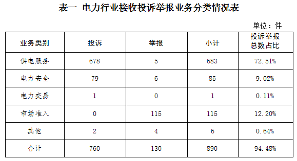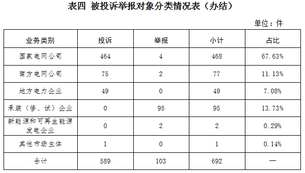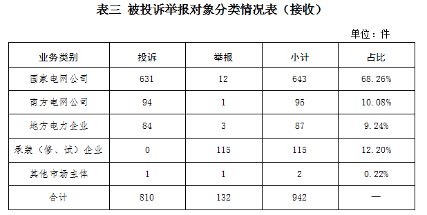 其他行業1件、占投訴舉報總數的0.11%。 2.按被投訴舉報對象分類 供電企業825件、占投訴舉報總數的87.58%,其中國家電網公司643件、占投訴舉報總數的68.26%,南方電網公司95件、占投訴舉報總數的10.08%,地方電力企業87件、占投訴舉報總數的9.24%;承裝(修、試)電力施工企業115件、占投訴舉報總數的12.20%;其他市場主體2件、占投訴舉報總數的0.22%。