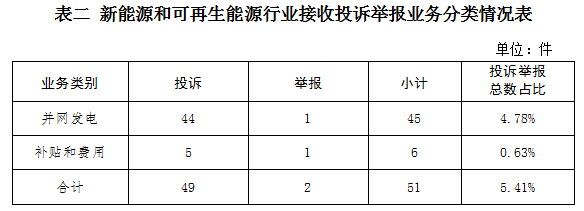 新能源和可再生能源行業排在第二位,數量為51件、占投訴舉報總數的5.41%,主要集中在并網發電、補貼和費用等方面。