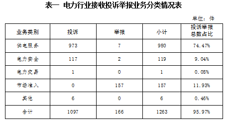 (一)分類情況 1.按被投訴舉報行業分類 電力行業排在首位,數量為1263件、占投訴舉報總數的95.97%,主要集中在供電服務、市場準入、電力安全等方面。