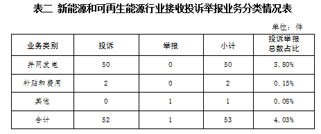 新能源和可再生能源行業排在第二位,數量為53件、占投訴舉報總數的4.03%,主要集中在并網發電、補貼和費用等方面。