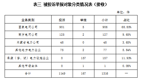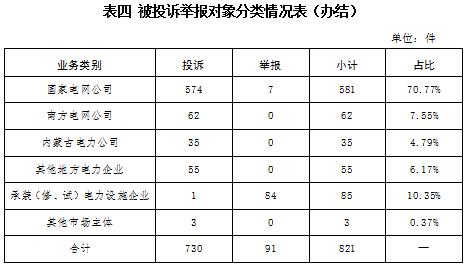 從被投訴舉報對象看,供電企業733件、占投訴舉報總數的89.28%,其中國家電網公司581件、占比70.77%,南方電網公司62件、占比7.55%,內蒙古電力公司35件、占比3.65%,其他地方電力企業55件、占比6.17%;承裝(修、試)電力設施企業85件、占比10.35%;其他市場主體3件、占比0.37%。