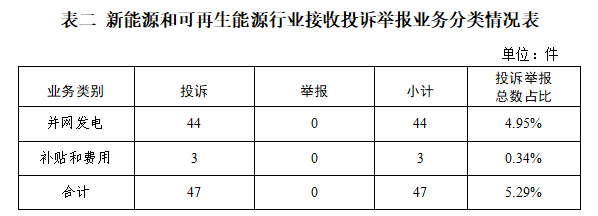 新能源和可再生能源行業(yè)排在第二位,數(shù)量為47件、占投訴舉報(bào)總數(shù)的5.29%,主要集中在并網(wǎng)發(fā)電、補(bǔ)貼和費(fèi)用等方面。