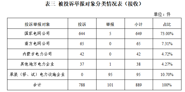 2.按被投訴舉報(bào)對(duì)象分類 供電企業(yè)794件、占投訴舉報(bào)總數(shù)的89.31%,其中國家電網(wǎng)公司649件、占投訴舉報(bào)總數(shù)的73.00%,南方電網(wǎng)公司65件、占投訴舉報(bào)總數(shù)的7.31%,內(nèi)蒙古電力公司42件、占投訴舉報(bào)總數(shù)的4.72%,其他地方電力企業(yè)38件、占投訴舉報(bào)總數(shù)的4.27%;承裝(修、試)電力設(shè)施企業(yè)95件、占投訴舉報(bào)總數(shù)的10.70%。