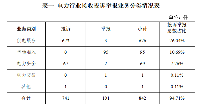 (一)分類情況 1.按被投訴舉報(bào)行業(yè)分類 電力行業(yè)排在首位,數(shù)量為842件、占投訴舉報(bào)總數(shù)的94.71%,主要集中在供電服務(wù)、市場準(zhǔn)入、電力安全等方面。