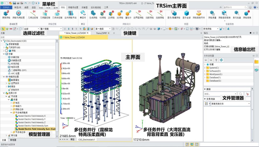 完成單位: 國家能源特高壓直流輸電工程成套設(shè)計(jì)研發(fā)(實(shí)驗(yàn))中心 三、高壓電力裝備多物理場計(jì)算專用軟件TRSim 形成首款幾何建模、網(wǎng)格剖分、計(jì)算求解、后處理全流程全自主內(nèi)核的國產(chǎn)電力裝備多物理場計(jì)算專用軟件,解決了使用通用商業(yè)軟件數(shù)據(jù)傳遞失真和計(jì)算效率低等問題。成果在昆柳龍?zhí)馗邏憾喽嘶旌现绷鬏旊姽こ涕_展了應(yīng)用驗(yàn)證,為工程設(shè)備設(shè)計(jì)運(yùn)行、運(yùn)維分析等提供技術(shù)支撐,對推動國產(chǎn)電力裝備專用軟件產(chǎn)品生態(tài)發(fā)展具有重大意義。