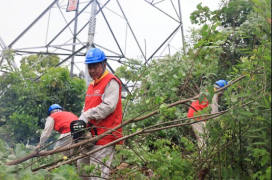 国网重庆电力员工在500千伏洪板一线237号塔附近修剪树竹。